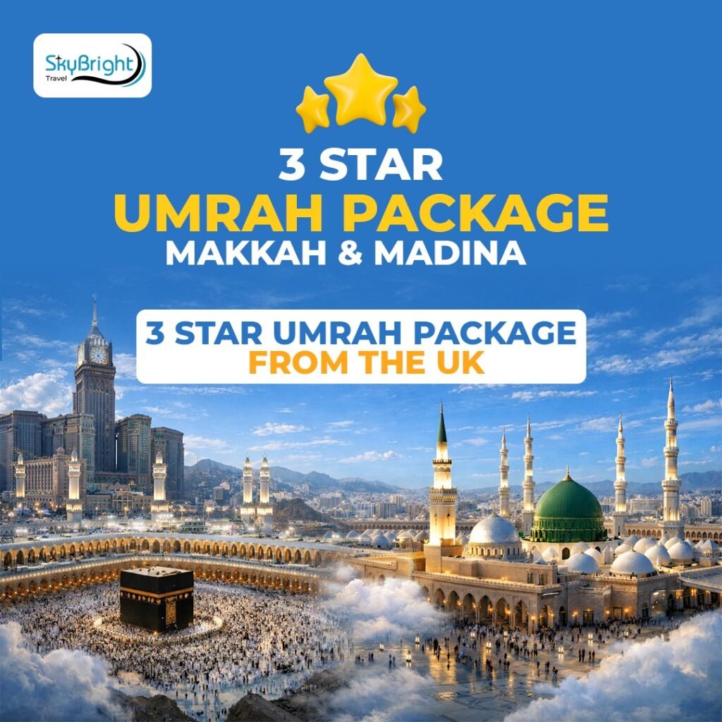 Our 3 Star Umrah Packages from the UK are designed for pilgrims seeking an affordable yet comfortable journey to Makkah and Madinah. These packages combine carefully selected 3-star hotels, return flights from major UK airports, Umrah visa processing, and ground transport in Saudi Arabia.
