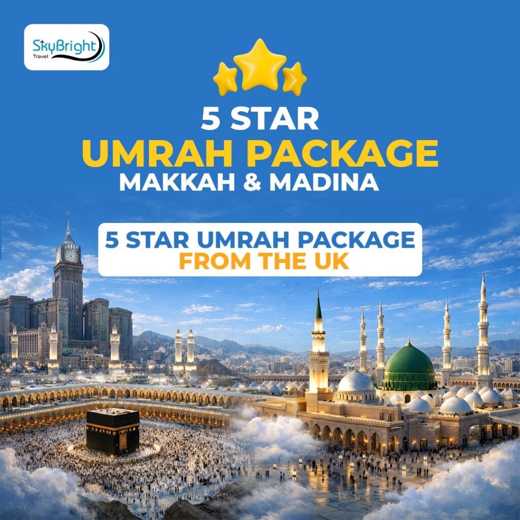 Our 5 Star Luxury Umrah Packages from the UK are tailored for pilgrims who desire premium comfort, Haram-front or near-Haram hotels, private transport options, and a refined travel experience.